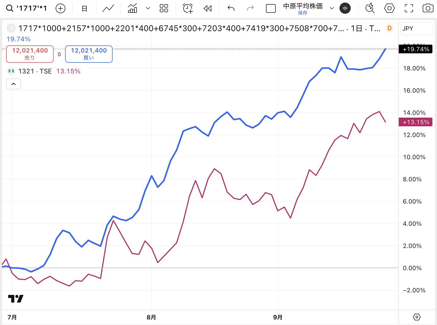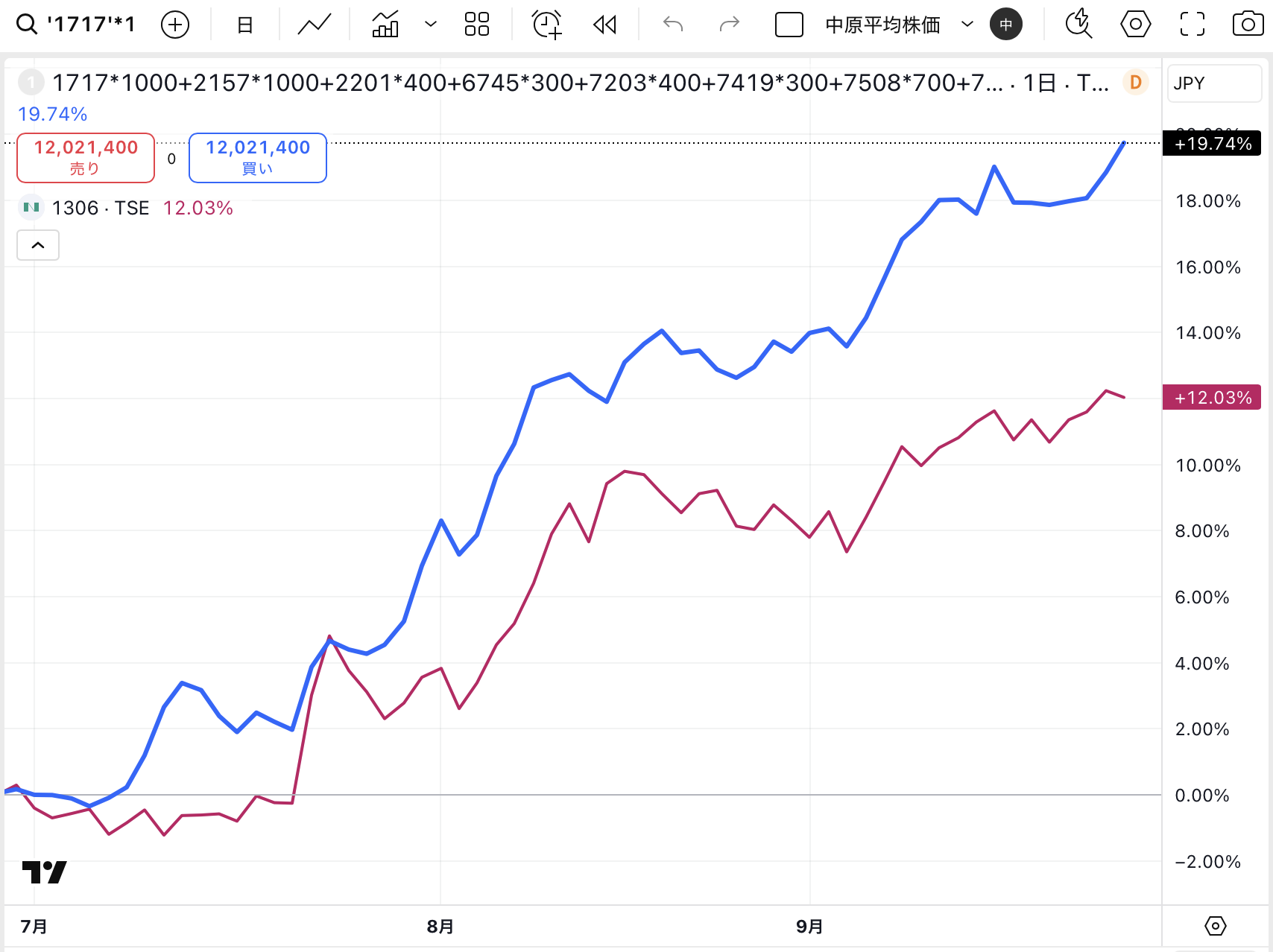 このチャートを見てほしいんですが、これは中原指数とTOPIX ETFの比較チャートですね。