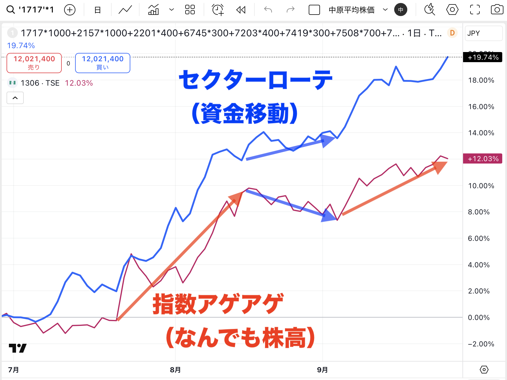 ちょくちょく動画でもお話しししていますが、「なんでも株高(指数が上がる局面)」と「セクターローテ(指数は横ばいorやや下げでセクター・銘柄間で資金移動が起きる局面)」は全然違うよなーと感じます。