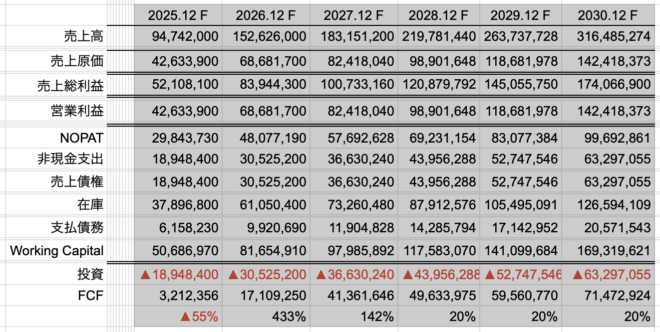 目先はアナリスト予想などを参考にして、DRAMの供給不足による値上がり&需要増で2026年には売上が急増→2030年まで20%増、というシナリオで計算しました。