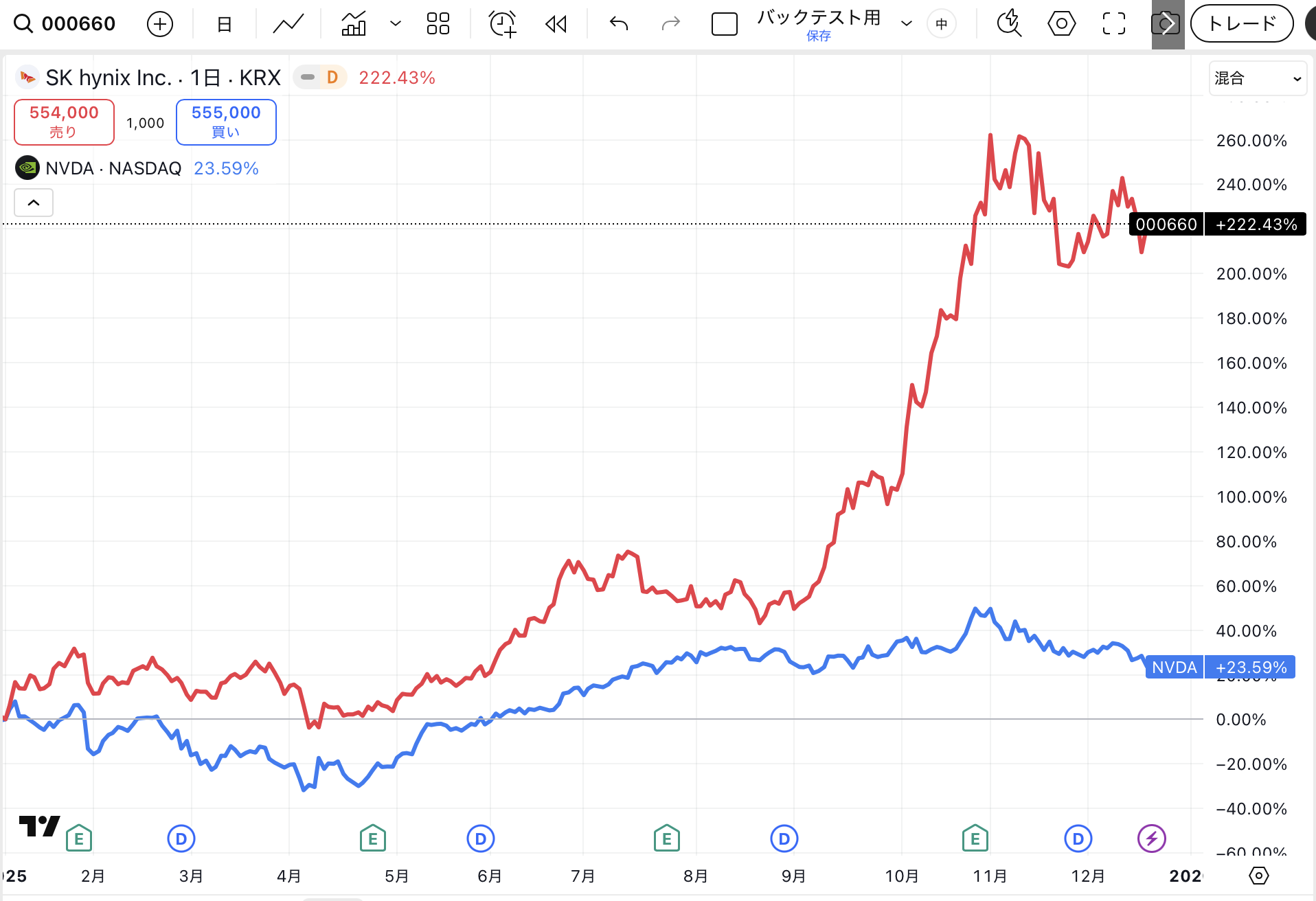 事実、NVIDIAと比べると、SKハイニックスの方が株価も強いですからね。