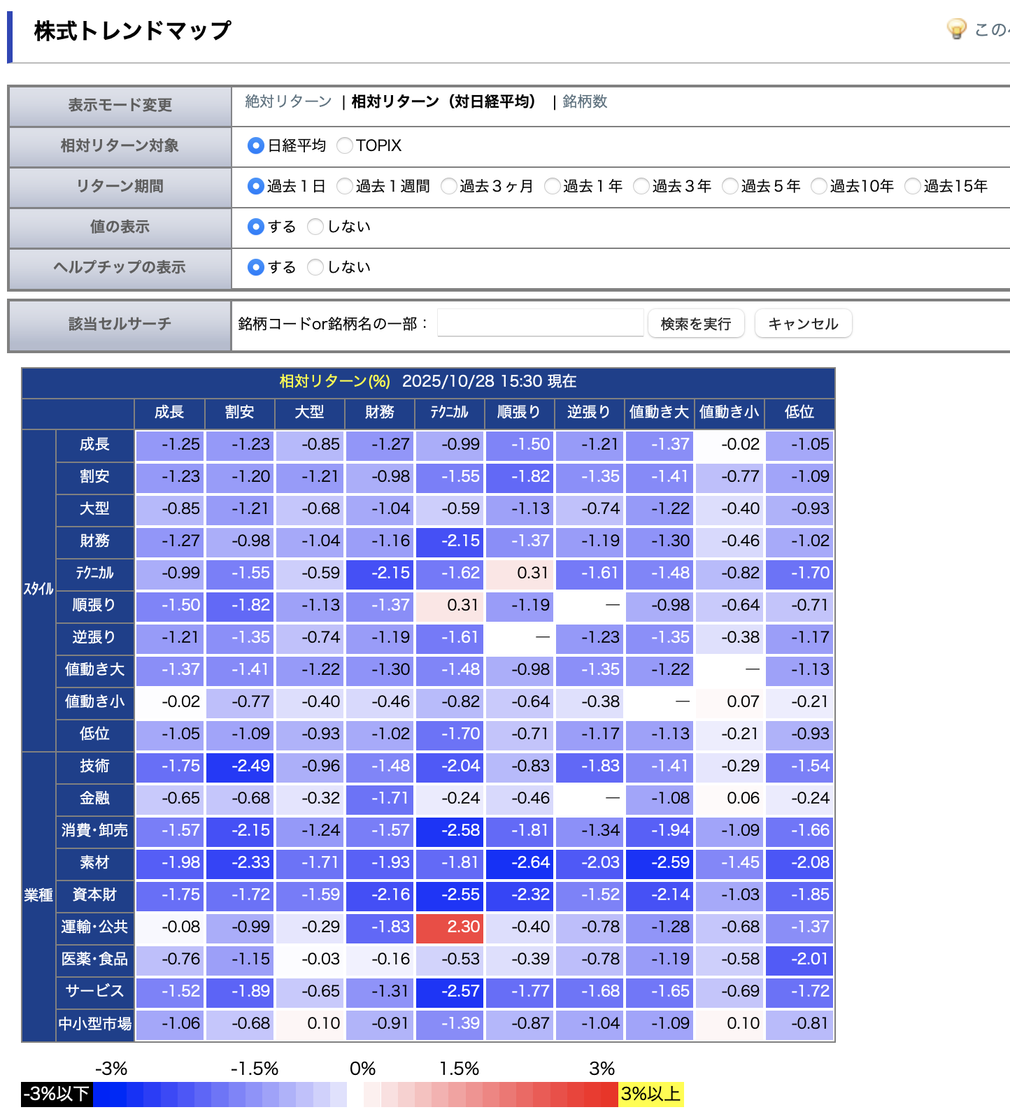 [株マップの株式トレンドマップ]をチェックしてみると、ほとんどのファクターが日経平均に劣後していますね。