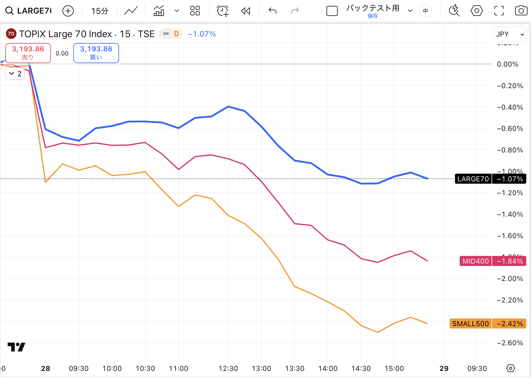 日経平均株価はほとんど下がっていませんが、個別株の下げがきつく、特に小型株ほどきつく下がりました。